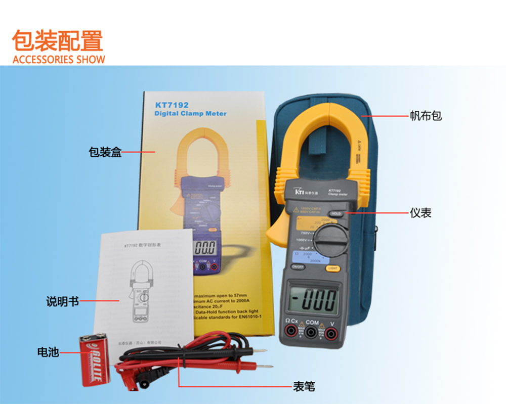 配件包括:9V 電池,布包,表筆,說明書,彩盒