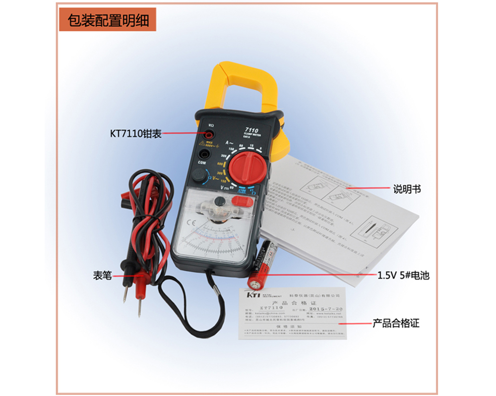 配件包括:1.5V 電池,表筆,說明書,插卡吸塑