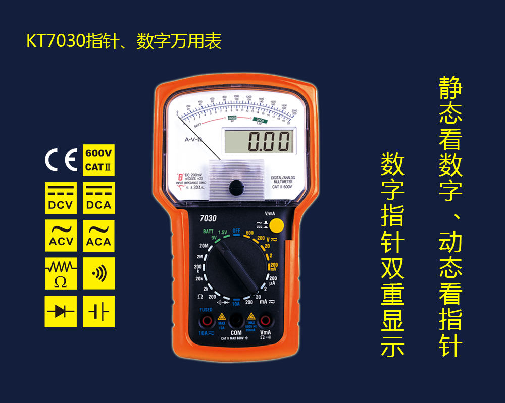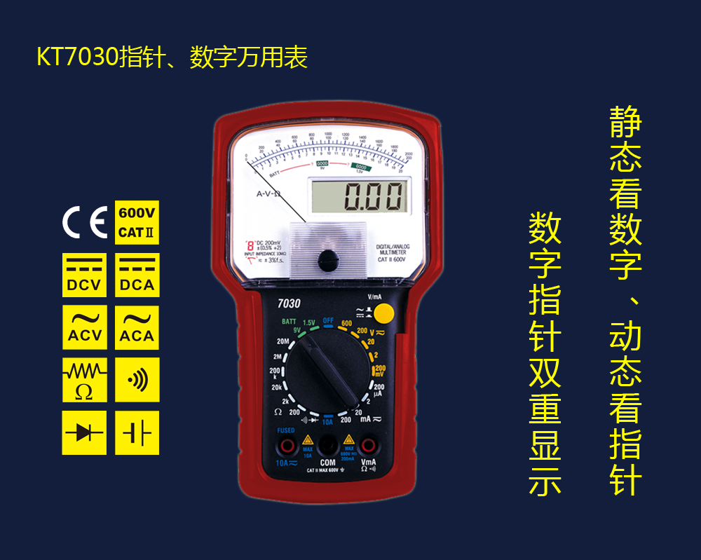 數字指針雙顯萬用表是科泰的數字模擬相結合的具體應用,實現了靜態看數字、動態看指針,數字指針同步。