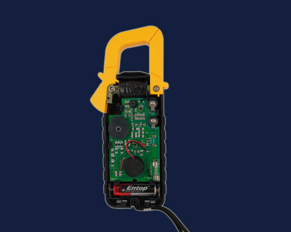 The analog clamp meter senses the current by conductor and through internal conversion the meter head indicates the reading.